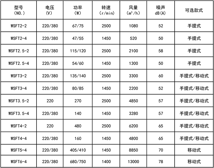 WSFT系列低噪声外转子手提式轴流风机该系列风机主要由外转子电容运转异步电动机、双法兰圆筒型机壳、网架和风叶组成。具有功耗低、风量大、振动小、噪声低、运行可靠等优良性能。