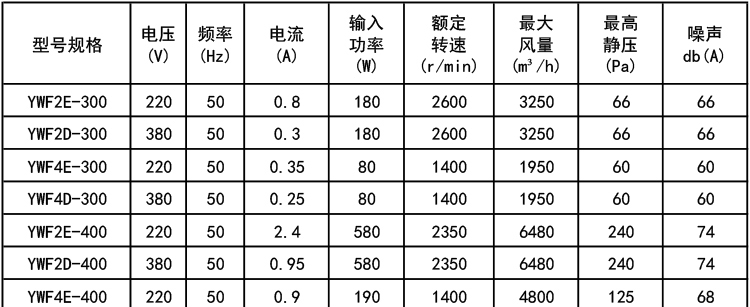 YWF系列轴流风机的绝缘等级为B级、F级,防护等级IP44,IP54。